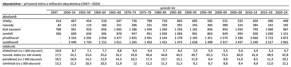 Při sledování úmrtnosti byl zaznamenán pokles na přelomu 50. a 60. let 20. století (1957: 694 zemřelých, 1960: 610 zemřelých, 1962: 762 zemřelých). Vzhledem k omezené plodnosti pokles počtu zemřelých osob nepřispěl k zvýšení přirozeného přírůstku. Ten byl 1959 (40 osob) a 1960 (92 osob) na velice nízké úrovni ve srovnání s lety předchozími (1953: 476 osob) i následujícími (1963: 227 osob). V letech 1960—1990 zůstávala míra úmrtnosti mužů ve věku 35—70 let vysoká, zatímco v případě žen došlo k jejímu snížení. Mnohem příznivěji poklesla úmrtnost dětí; kojenecká úmrtnost se snížila během 20 let téměř na polovinu. Vzrostla úmrtnost na nemoci srdce a oběhové soustavy i na novotvary, naopak se snížila úmrtnost následkem poranění a otrav.