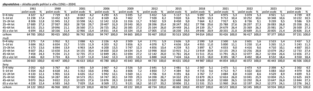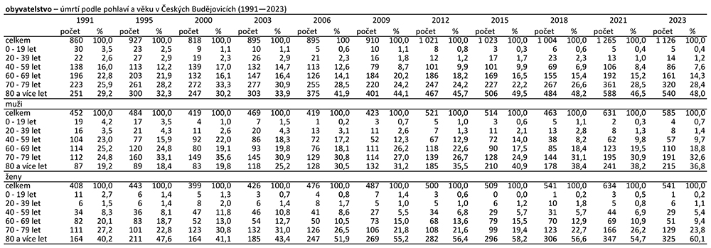 V souvislosti s úbytkem českobudějovického obyvatelstva nelze opomenout ani změnu místní věkové struktury. O regresivním charakteru místní populace svědčí postupný úbytek dětské složky ve věku do čtrnácti let (1961: 24,1 %; 1980: 23,4 %; 2001: 15,4 %; 2004: 13,9 %; 2012: 13,8 %) a převaha osob ve stáří nad 65 let (1961: 10,3 %; 1980: 11,4 %; 2001: 13,4 %; 2004: 14,1 %; 2012: 17,5 %). Plně v souladu s obecnými zákonitostmi dlouhodobého populačního vývoje si českobudějovické ženy zachovávají převahu nad muži (1961 – 34 122 : 30 663; 1980 – 46 968 : 43 447; 2001 – 50 129 : 46 613; 2004 – 49 168 : 45 454; 2012 – 48 734 : 44 733). Zatímco v případě mužů se počty umírajících začínají zvyšovat po dosažení 40 roků věku, u žen je tomu až o 20 let později, takže jejich naděje na dožití je vyšší než u mužů. Příčiny úmrtí jsou však obdobné v případě příslušníků obou pohlaví. I zde je během posledních let patrný určitý posun – zatímco výskyt nemoci oběhového ústrojí se snížil (1990: 54,8 %; 1995: 50,0 %; 2004: 45,2 %; 2012: 45,3 %), četnost novotvarů vzrostla, ale od roku 2004 již spíše klesá (1990: 25,6 %; 2000: 30,8 %; 2004: 32,9 %; 2012: 26,9 %).