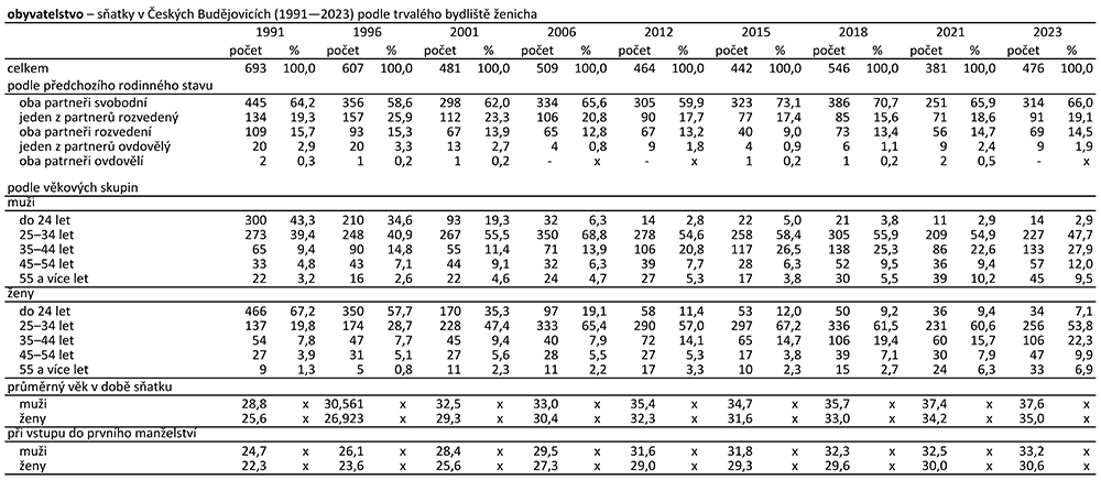 Demografický vývoj Českých Budějovic zpravidla nevybočoval z obecných vývojových trendů v zemi. V poválečném období došlo ke snížení věku způsobilosti k uzavření manželství na 18 roků, průměrný sňatkový věk svobodných snoubenců následně klesl pod hranici 22 let u žen a 25 roků u mužů. Na uvedené úrovni jen s malými výkyvy setrval po téměř dalších 20 let. Vysoký počet manželství již v nízkém věku měl sice pozitivní vliv na pokles bezdětnosti, ale mnohem větší následky přinášela rostoucí rozvodovost. Ta byla nejvyšší ve věku 20—30 let, v prvních letech po vstupu do manželství (maximální intenzita se projevovala ve 3. a 4. roce trvání). Zatímco 1953 bylo v Českých Budějovicích evidováno 75 rozvodů, 1957 již 139.