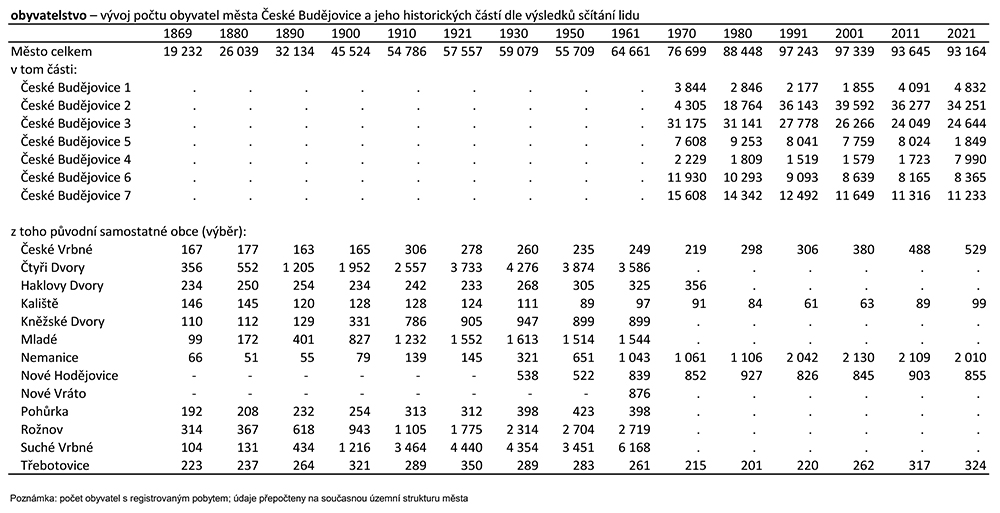Od pol. 90. let 20. století je patrný trvalý úbytek obyvatelstva jihočeské metropole, který se prohloubil po roce 2000 (1995: 99 872 osob, 2000: 98 633 osob, 2004: 94 945 osob). Jeho příčinu je nutné spatřovat v převaze zemřelých a vystěhovalých osob nad narozenými a přistěhovalými. Přirozený přírůstek, který se začal projevovat v záporných hodnotách