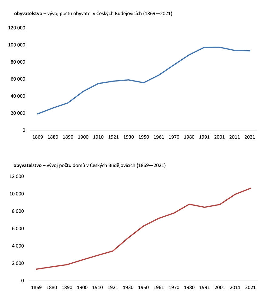 Za významný mezník v demografickém vývoji Českých Budějovic lze označit rok 1848, kdy došlo ke zrušení poddanství. Teprve na jeho základě mohlo probíhat postupné vyvazování osob z poddanských povinností. Následný příliv venkovského obyvatelstva do měst, který nastal v mnohem hojnější míře než po 1781, souvisí s počešťováním Českých Budějovic. Ve 30. letech 19. století přicházeli noví obyvatelé do Českých Budějovic z Lišova, Velešína, Netolic, Veselí nad Lužnicí a z jiných míst v okolí. Rozsah populace Českých Budějovic se začal nebývalou měrou zvyšovat. Měšťanští majitelé domů se snažili využít poptávky po bytech a začali na svých parcelách stavět nádvorní trakty s malými a nevyhovujícími byty. Přibývaly též nástavby na jednoposchoďových domech. Ale ani to nestačilo, a tak kdo mohl, snažil se zakoupit pozemek na předměstí. Nejvíce příležitostí tehdy nabízel volný prostor mezi Pražskou třídou a Rudolfovskou třídou. V letech 1846—1850 se počet obyvatelstva zvýšil z 8 730 na 10 592 osob a na prahu 60. let 19. století již dosahoval výše 15 185 osob (7 212 osob bydlelo ve vnitřním městě, 4 845 na Pražském předměstí, 2 244 na Vídeňském a 884 na Lineckém předměstí). Až do začátku první světové války (1914) pokračoval početní nárůst místního obyvatelstva (1869: 17 413 osob, 1880: 23 845 osob, 1890: 28 491 osob, 1900: 39 328 osob, 1910: 44 538 osob), který přímo korespondoval s hospodářským rozvojem, doloženým existencí 37 velkých továren na území města k 1905.