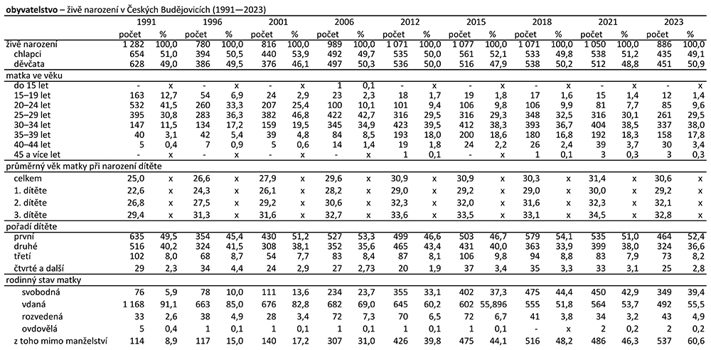 Výrazně poklesla porodnost – počty narozených dětí se v Českých Budějovicích začaly snižovat (1990: 1 326 dětí, 1995: 901 dětí, 2000: 893 dětí). Po 2003, kdy se narodilo nejméně dětí v novodobé historii města (838), lze očekávat vzestup porodnosti (2004: 871; 2008: 1 139; 2010: 1 136), který by mohl svědčit o opožděném zapojení silných populačních ročníků ze 70. let 20. století do soudobého reprodukčního procesu. Vliv tohoto faktoru na porodnost však postupně klesá (2011: 999; 2012: 1 071). V návaznosti na zvyšování sňatkového věku vzrostl i průměrný věk rodících žen, a to z 24,8 (1990) na 25,4 (1994). Po roce 2000 již téměř polovina rodících žen náležela do věkové skupiny 25—29 let (2003: 49,2 %). V dalších letech se nejčastější věk při porodu přesunul do skupiny 30—34 let (2012: 39,5 %). Zmíněný stav plně koresponduje se změnou životního stylu, který nastal v důsledku polistopadových změn.