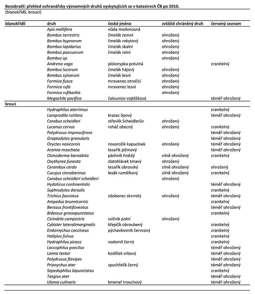 Po 2010 se z Hlubockých hrází do Českých Budějovic rozšířil roháč obecný (Lucanus cervus) a tesařík obrovský (Cerambyx cerdo). Typickým nelesním budějovickým střevlíkem je, v jiných regionech vzácný, střevlík Scheidlerův (Carabus scheidleri). Hojným nápadným městským druhem je chroustek letní (Amphimallon solstitiale), který se rojí za soumraku v červnových dnech.
