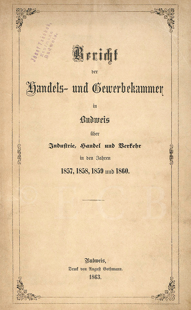 MAYSL, Albert. Obchodní a průmyslová komora v Čes. Budějovicích 1850-1905. V Č. Budějovicích: Nákladem Obchodní a průmyslové komory, 1906. 194 s.