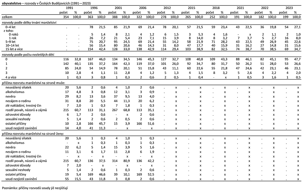 Demografický vývoj Českých Budějovic zpravidla nevybočoval z obecných vývojových trendů v zemi. V poválečném období došlo ke snížení věku způsobilosti k uzavření manželství na 18 roků, průměrný sňatkový věk svobodných snoubenců následně klesl pod hranici 22 let u žen a 25 roků u mužů. Na uvedené úrovni jen s malými výkyvy setrval po téměř dalších 20 let. Vysoký počet manželství již v nízkém věku měl sice pozitivní vliv na pokles bezdětnosti, ale mnohem větší následky přinášela rostoucí rozvodovost. Ta byla nejvyšší ve věku 20—30 let, v prvních letech po vstupu do manželství (maximální intenzita se projevovala ve 3. a 4. roce trvání). Zatímco 1953 bylo v Českých Budějovicích evidováno 75 rozvodů, 1957 již 139.