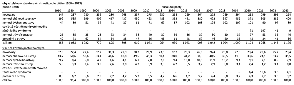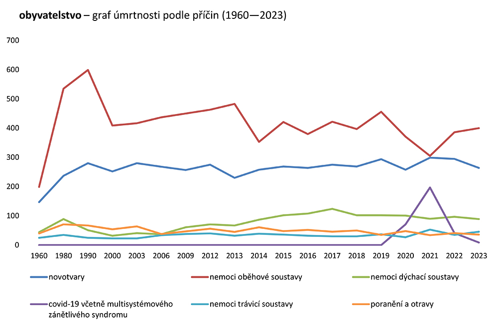 Při sledování úmrtnosti byl zaznamenán pokles na přelomu 50. a 60. let 20. století (1957: 694 zemřelých, 1960: 610 zemřelých, 1962: 762 zemřelých). Vzhledem k omezené plodnosti pokles počtu zemřelých osob nepřispěl k zvýšení přirozeného přírůstku. Ten byl 1959 (40 osob) a 1960 (92 osob) na velice nízké úrovni ve srovnání s lety předchozími (1953: 476 osob) i následujícími (1963: 227 osob). V letech 1960—1990 zůstávala míra úmrtnosti mužů ve věku 35—70 let vysoká, zatímco v případě žen došlo k jejímu snížení. Mnohem příznivěji poklesla úmrtnost dětí; kojenecká úmrtnost se snížila během 20 let téměř na polovinu. Vzrostla úmrtnost na nemoci srdce a oběhové soustavy i na novotvary, naopak se snížila úmrtnost následkem poranění a otrav.